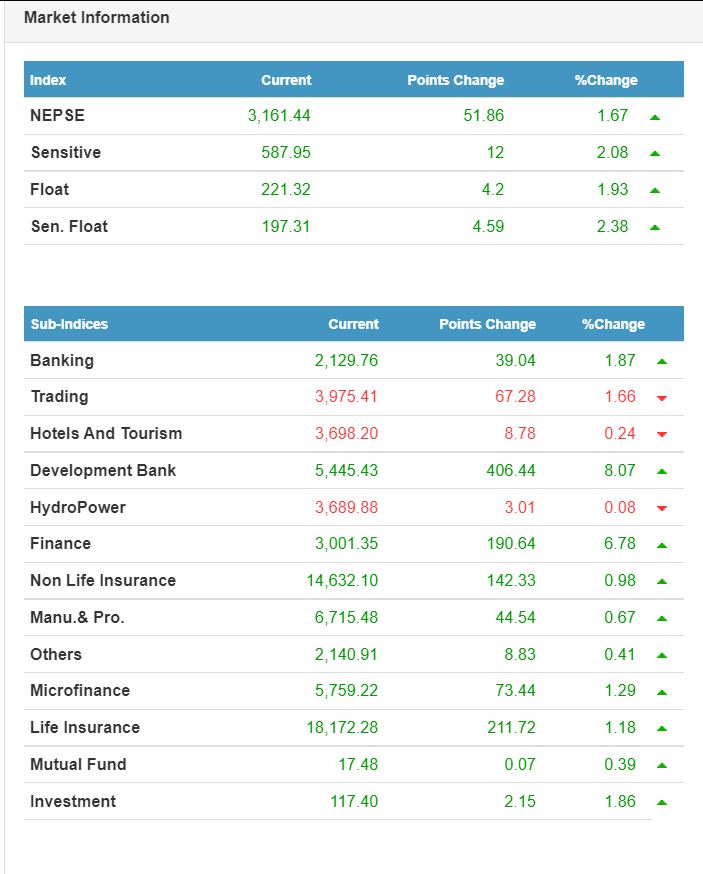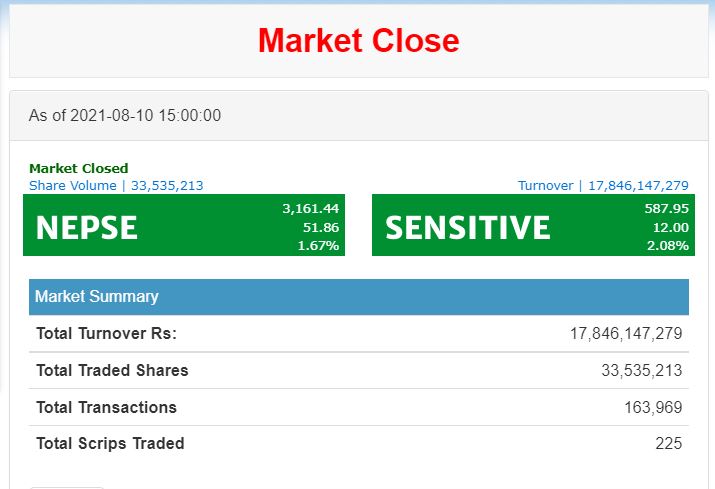 नेपाल स्टक एक्सचेन्ज (नेप्से) का अनुसार सेयर कारोबार मापक नेप्से परिसूचक ५१.८६ अंकले बढेर बढेर ३१६१.४४ विन्दुमा पुगेको छ । यो हालसम्मकै उच्च हो । आज नेप्से १.६७ अंकले बढेको हो ।