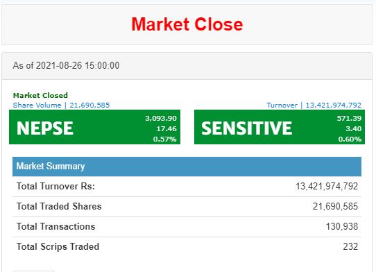 नेपाल स्टक एक्सचेन्ज (नेप्से) का अनुसार सेयर कारोबार मापक नेप्से परिसूचक १७.४६ अंकले बढेर ३०९३ दशमलव ९० विन्दुमा पुगेर बन्द भएको छ । आज नेप्से ०.७५ प्रतिशतले बढेको हो । यस्तै, सेन्सेटिभ परिसूचक पनि ३.४० अंकले बढेर ५७१.३९ विन्दुमा पुगेको छ ।
